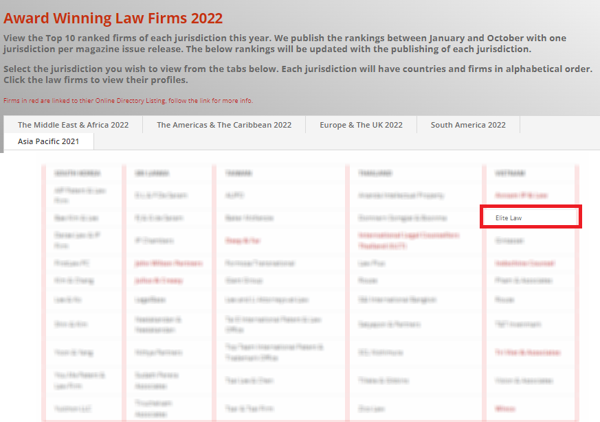 Patent Lawyer, is an international Patent legal publication based in the UK. This magazine is full of information about Patents and includes statistics of prestigious Patent Law Offices in many countries and regions around the world. The magazine specializes in evaluating and ranking Law Firms around the world – has just ranked ELITE Law Firm in the Top 10 prestigious Law Firms on Intellectual Property in Vietnam in providing legal services on Patent.