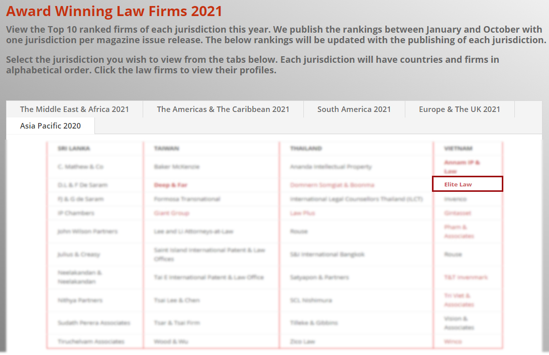 With constant efforts and professionalism in providing Intellectual Property services for both domestic and foreign clients, ELITE LAW FIRM has been ranked as a “NOTABLE FIRM” holding the 2nd position in the Patent Lawyer magazine ranking in 2021.