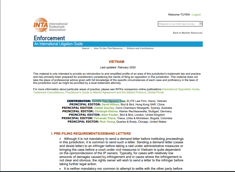 In January 2020, Lawyer Nguyen Tran Tuyen, who is Director of ELITE LAW FIRM, has made a contribution to the procedure of enforcement of Intellectual Property rights by civil measures in Vietnam following the current laws.
