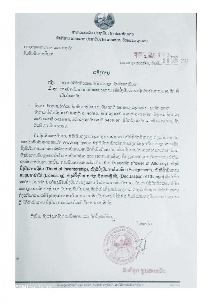 Also, the ORIGINAL SIGNED POA, Declaration of change, and Agreement of Assignment are still required to be filed with the Laos DIP within one month from the filing date/ requesting date as normal. This Notification was taken into effect on June 26, 2023.